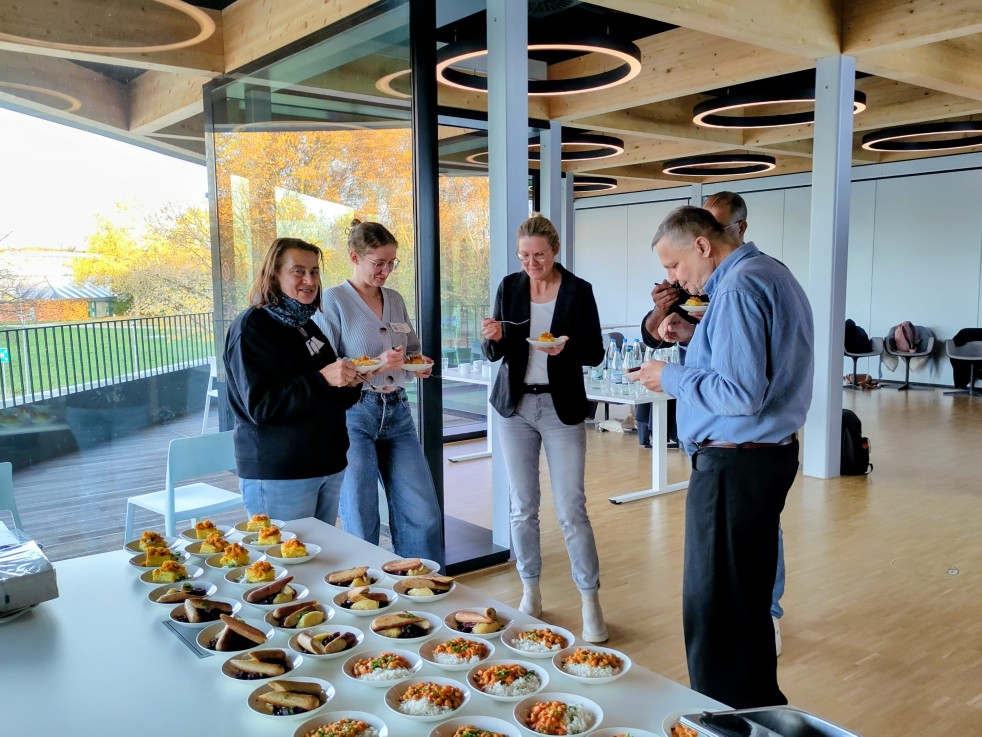 Nach den Betriebspräsentationen bot uns die EAD eine Verkostung ausgewählter Gerichte mit regionalen Zutaten, die aktuell auf dem Speiseplan stehen. Die Teilnehmenden konnten sich überzeugen: so lecker, abwechslungsreich und regional kann Kita- und Schulverpflegung sein! Während der Verkostung und der gesamten Veranstaltung gab es ausreichend Zeit für Fragen, Austausch und Vernetzung. Die Teilnehmenden nutzten die Gelegenheit, Kontakte zu knüpfen, Kooperationsmöglichkeiten zu diskutieren und praktische Herausforderungen aus dem Alltag der GV zu teilen.